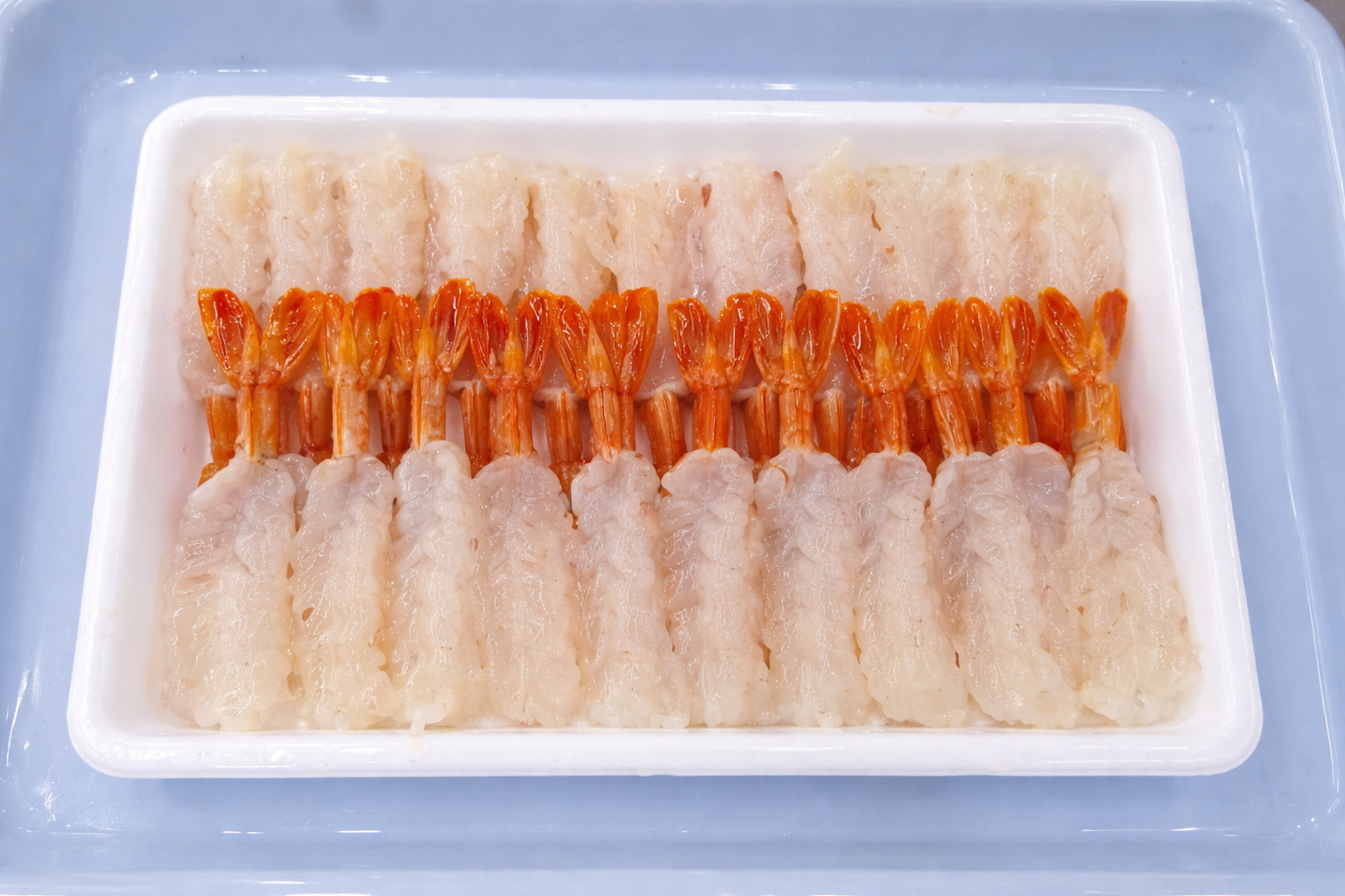 鮮やかな赤色が特徴の赤エビを、寿司用途向けに開き加工した業務用商品です。